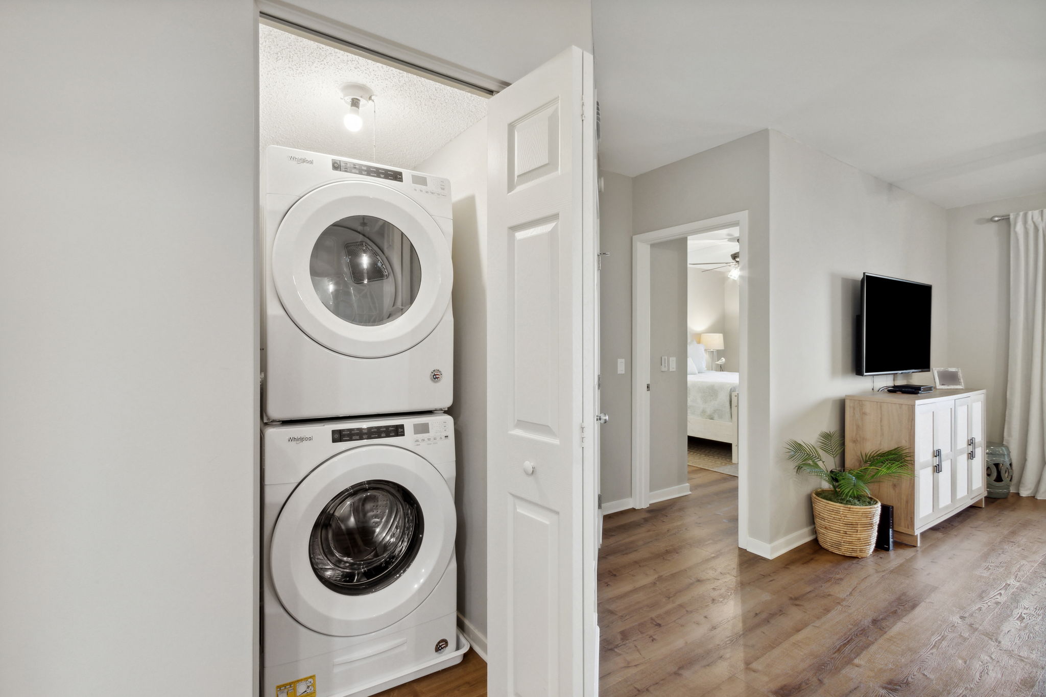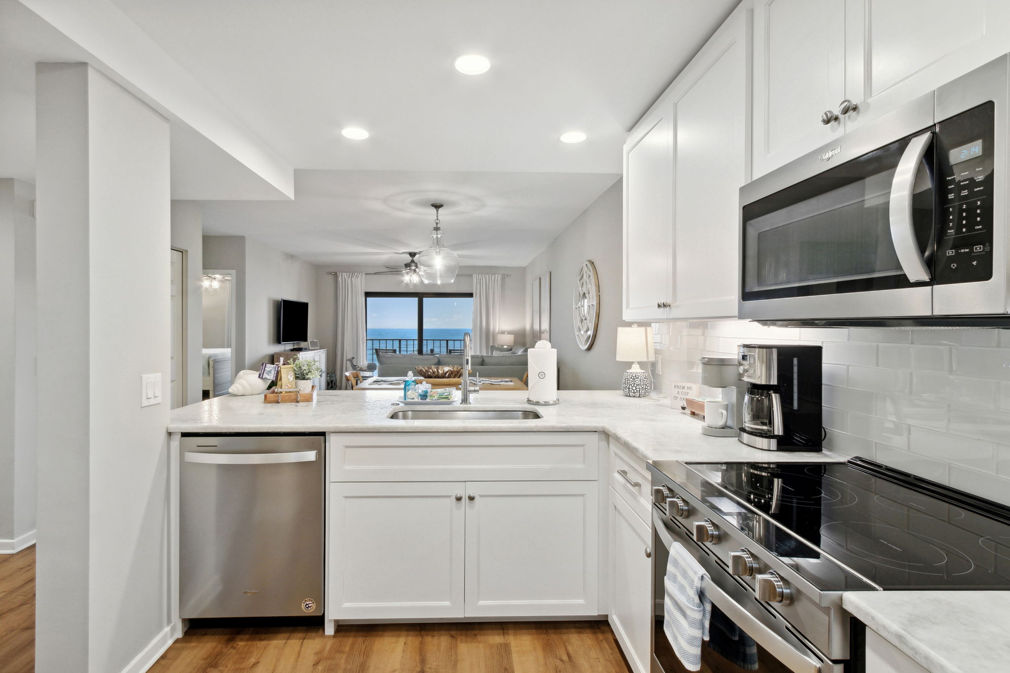 The gourmet kitchen adjacent to the living area boasts a stunning quartz-topped island with seating for three, a charming farmhouse sink, pristine white cabinets, and top-of-the-line stainless steel appliances. Engage in culinary adventures while basking in the breathtaking ocean sunsets. Adjacent to the kitchen, a dining table accommodating four people is thoughtfully positioned. For added practicality, a laundry nook is easily accessible just off the kitchen.