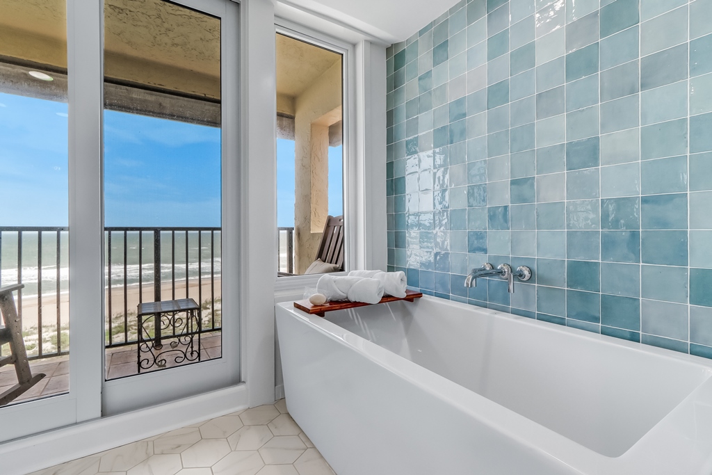 Indulge in the luxury of a fully renovated and one of the best 3 bedroom Penthouse rentals Amelia Island, which is a tastefully refurnished penthouse adorned with high-end furniture and elegant decor by a professional interior designer. The first floor welcomes you with an oceanfront living room featuring comfortable furniture, an electric fireplace, and a large smart flat-screen TV. Every corner of the living room, dining area, and kitchen unveils breathtaking ocean views. Step onto the spacious oceanfront balcony for a mesmerizing scene of the ocean and island.