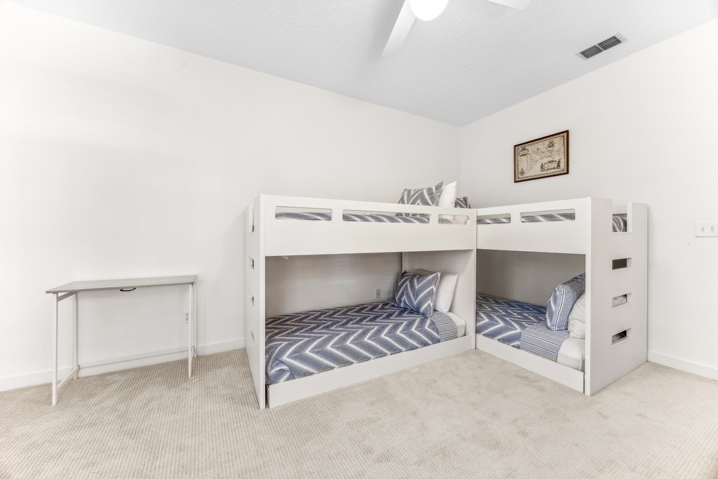 The main floor guest suite offers convenience and privacy, featuring a king bed, writing desk, and ensuite bathroom with a walk in shower, perfect for guests who prefer single level living. Upstairs, the spacious primary suite welcomes you with a king bed, TV, and a spa inspired ensuite bath complete with double vanities, a soaking tub, and a walk in shower. Across the hall, the cheerful third bedroom with two twin over twin bunk beds sleeps four comfortably, ideal for children or visiting family, and includes its own full bath with a tub.
